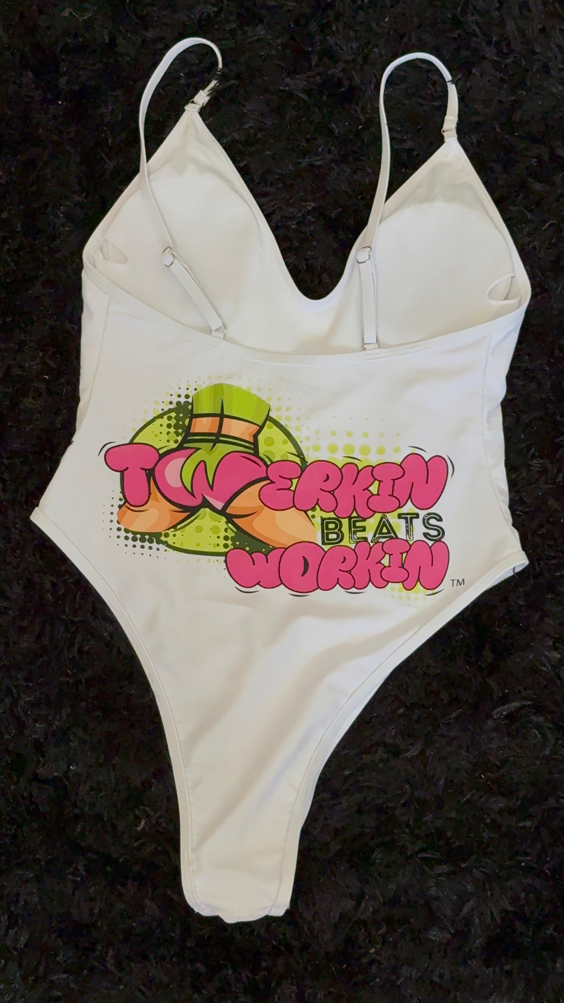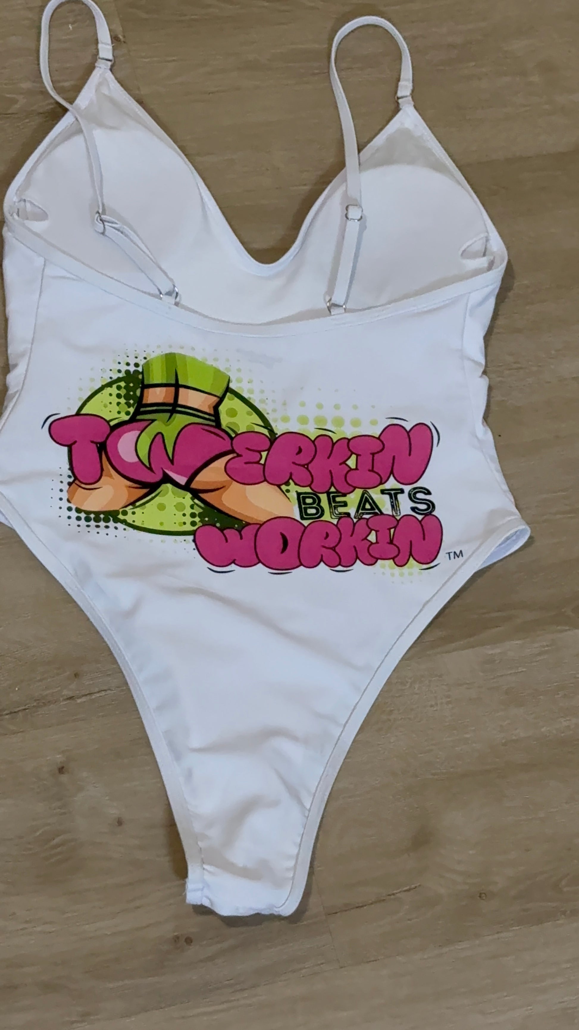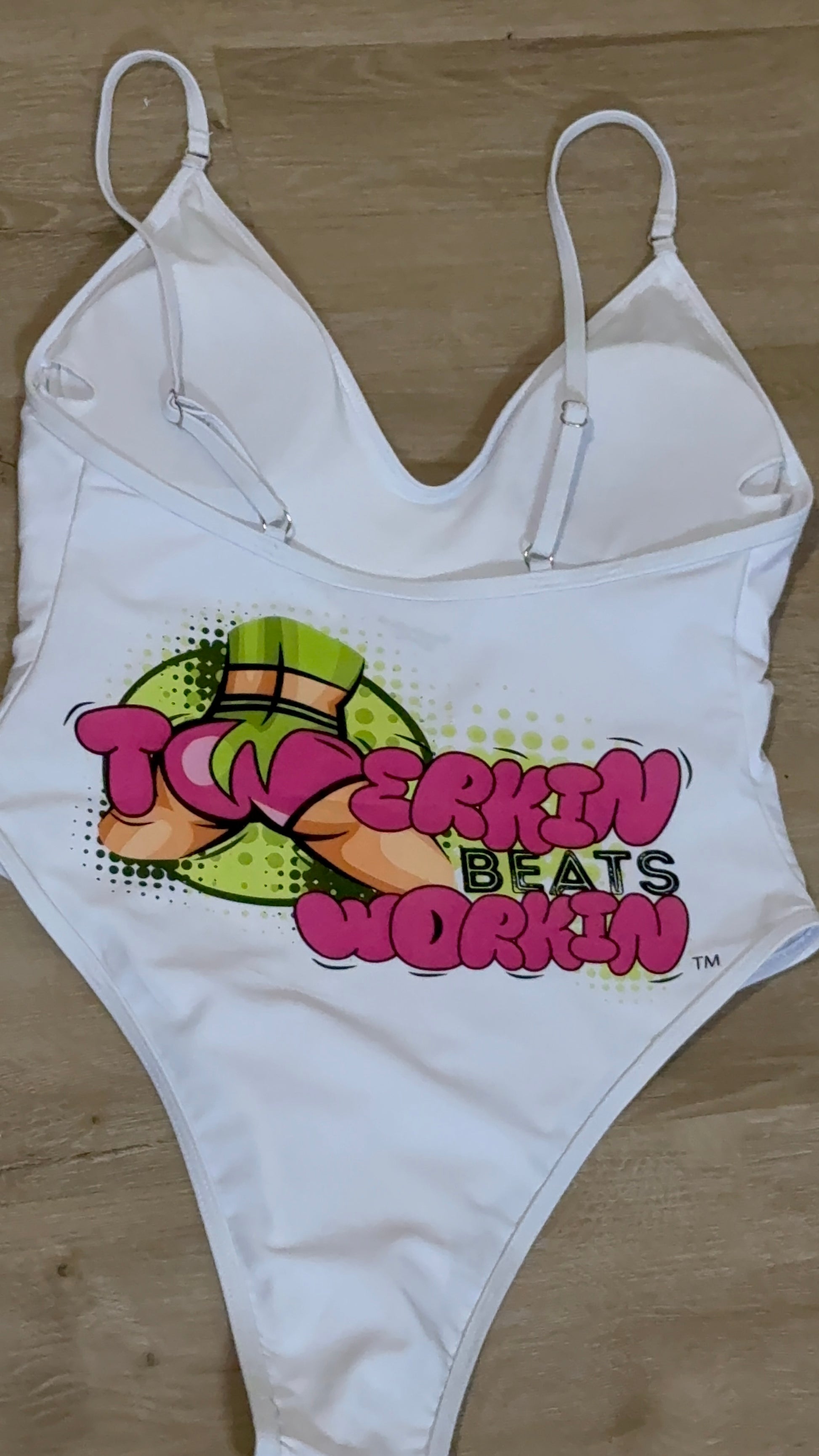 Pink and green Twerkin’ Beats Workin’Booty designed one piece