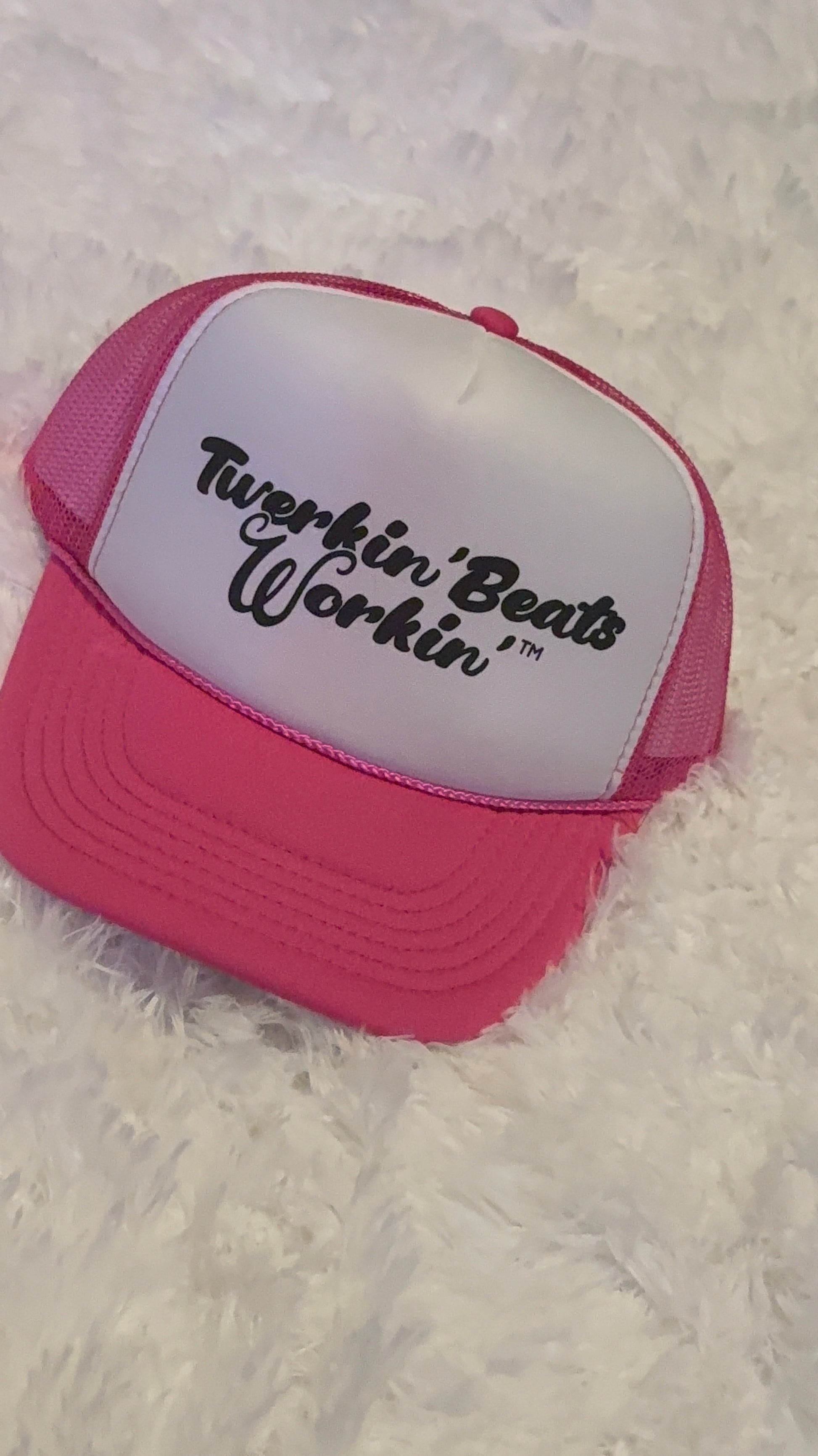 Pink and white with regular Twerkin’ Beats Workin’ in black logo